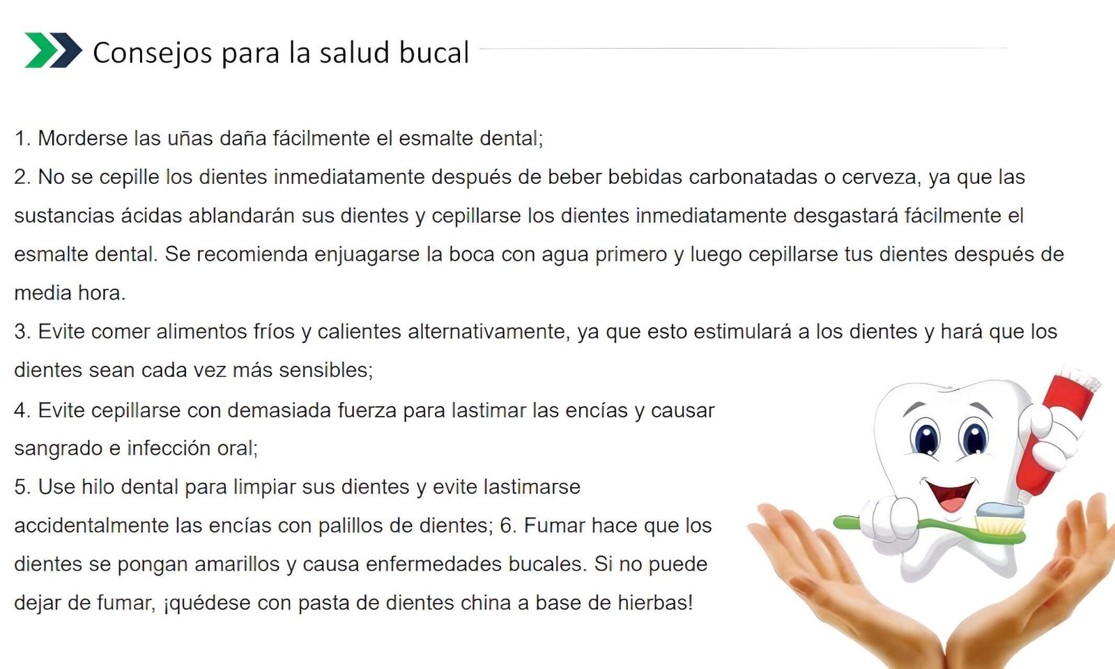 • Cuidadosamente formulada con hierbas chinas tradicionales para el cuidado de la salud dental.